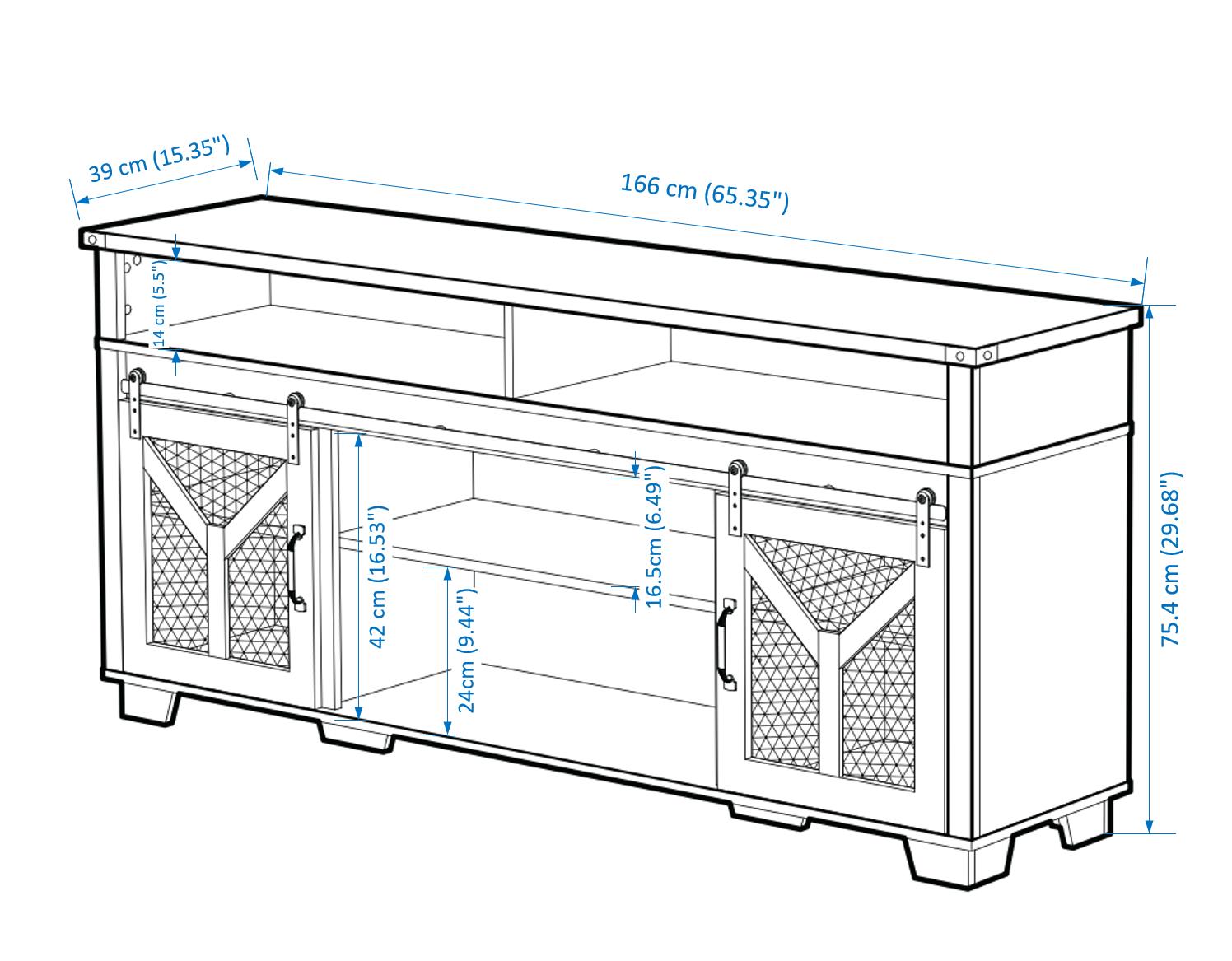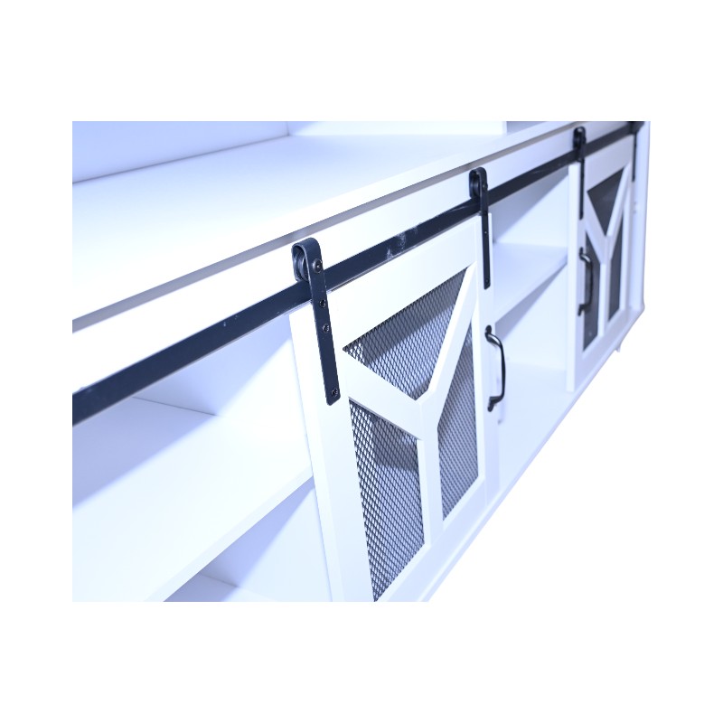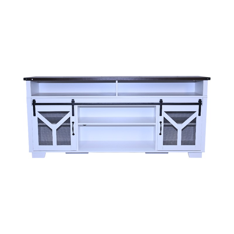 • Stylish and Functional Design:This TV stand features a unique combination of a white body and a black walnut - colored top, creating an elegant and modern look that seamlessly blends with various home decor styles. Sliding barn doors with inset metal mesh and dark iron-tone hardware not only add a touch of rustic charm but also provide convenient storage access, allowing you to keep your media devices and accessories organized.