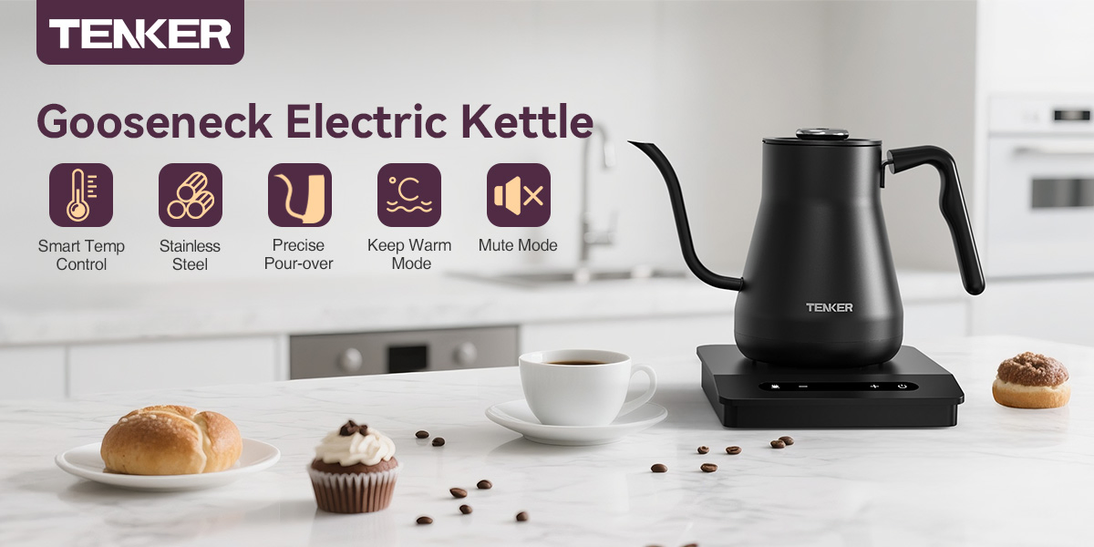 ±1°F Temp Control: TENKER variable temperature gooseneck kettle allows 1°F temp adjustment from wide range between 104 to 212°F. Built-in LCD panel indicates target temp & realtime water temp. 5 Temp Presets meet needs of different drink, such as Black tea, Coffee, Oolong, Green tea, White tea.