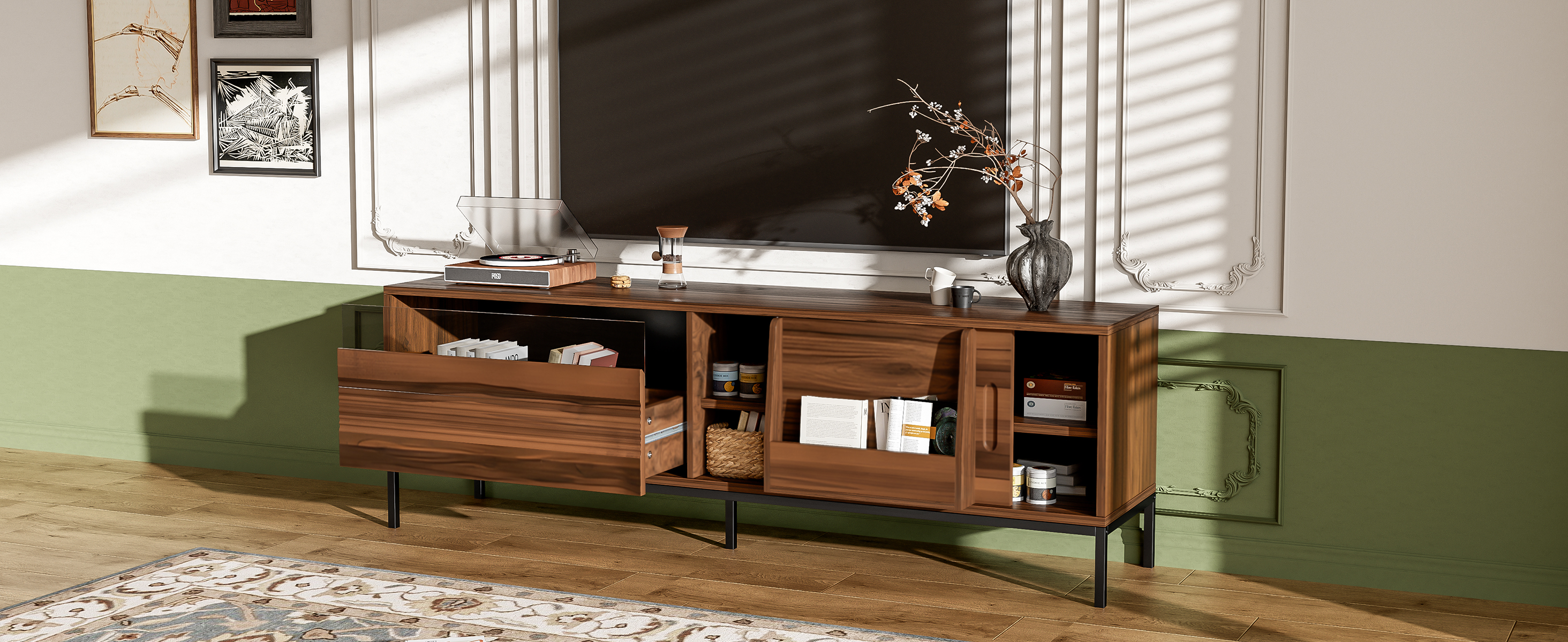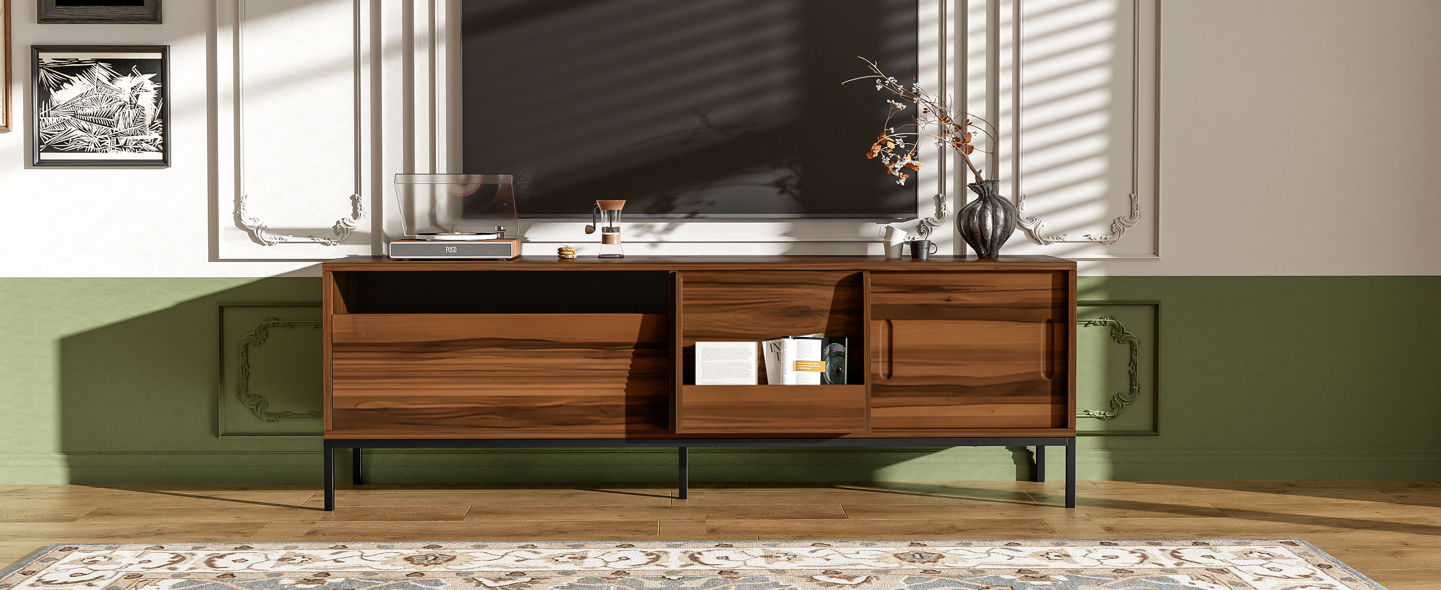 Product Name:U-Can 70.8'' Modern TV Stand for TVs up to 75 Inches, Entertainment Center with Storage Space, Sliding Doors, Adjustable Shelves and Metal Frame, Mid Century Modern Media TV Console Table for Living R